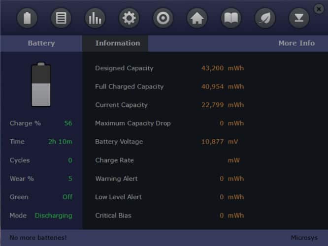 Το κύριο παράθυρο της εφαρμογής εμφανίζει όλες τις λεπτομερείς πληροφορίες της μπαταρίας, όπως την σχεδιασμένη χωρητικότητα, χωρητικότητα πλήρους φόρτισης, ένταση, επίπεδο φθοράς και κύκλοι πλήρους εκφόρτισης.