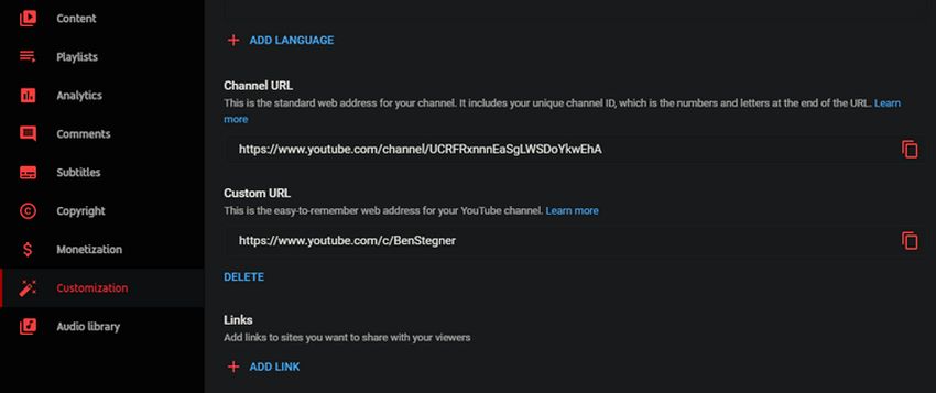 Σε αυτήν τη σελίδα, κάτω από το URL του καναλιού, θα δείτε την κανονική URL διεύθυνση του καναλιού σας, καθώς και το πεδίο για να ορίσετε μια προσαρμοσμένη URL διεύθυνση. Το πεδίο αυτό θα το δείτε μόνο εάν πληροίτε τις προϋποθέσεις. Χρησιμοποιήστε το για να επιλέξετε το προσαρμοσμένο URL του καναλιού σας.