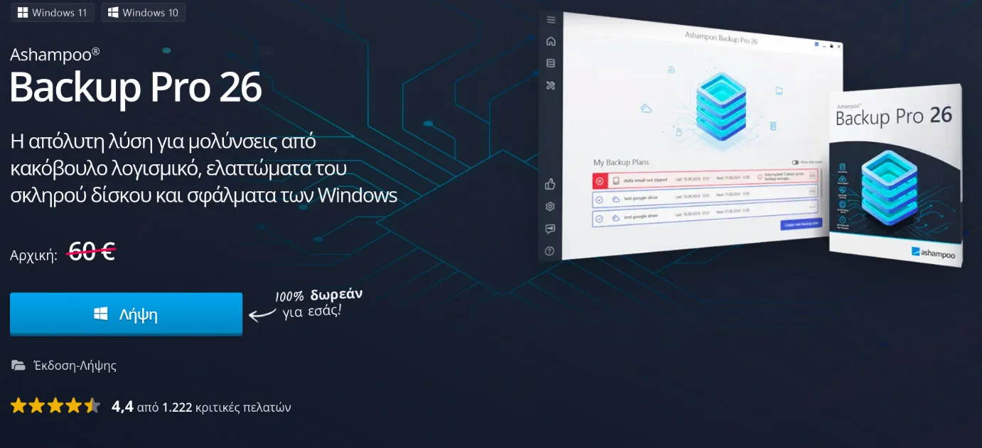 Το Ashampoo Backup Pro 26 είναι μια ισχυρή λύση δημιουργίας αντιγράφων ασφαλείας για τα Windows που έχει σχεδιαστεί για την ασφαλή αποθήκευση και επαναφορά δεδομένων, κατατμήσεων και εκκινήσιμων λειτουργικών συστημάτων.