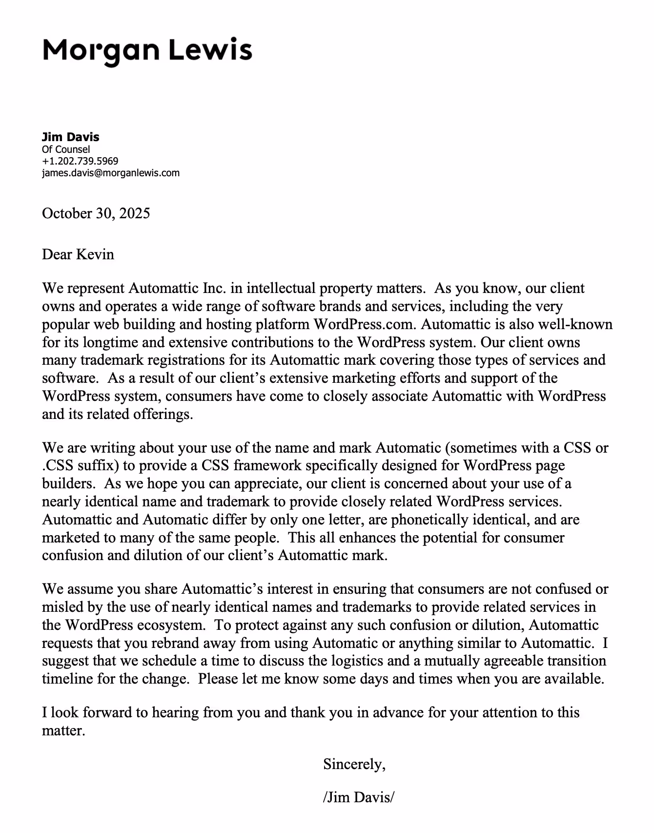 “Όπως γνωρίζετε, ο πελάτης μας κατέχει και λειτουργεί ένα ευρύ φάσμα εμπορικών σημάτων και υπηρεσιών λογισμικού, συμπεριλαμβανομένης της πολύ δημοφιλούς πλατφόρμας δημιουργίας και φιλοξενίας ιστοσελίδων WordPress.com”, αναφέρει σε επιστολή της 30ής Οκτωβρίου ο Jim Davis, δικηγόρος πνευματικής ιδιοκτησίας που εκπροσωπεί την Automattic.
