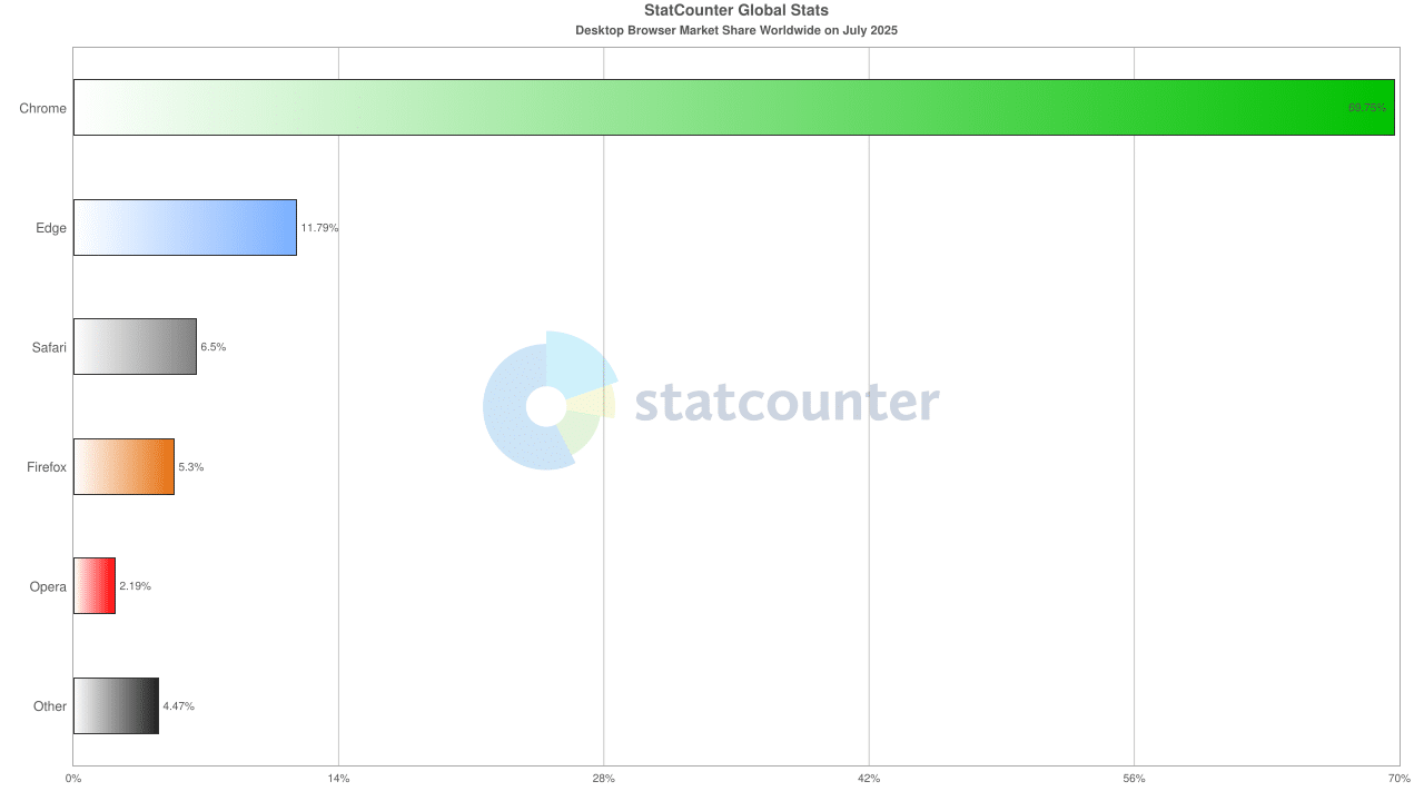 Σύμφωνα με τα στοιχεία της Statcounter για τον Ιούλιο του 2025, το πιο δημοφιλές πρόγραμμα περιήγησης στον κόσμο εδραιώνει περαιτέρω τη θέση του. Τον περασμένο μήνα, ο Chrome αύξησε το μερίδιο αγοράς του στο 69,98%, σκαρφαλώνοντας σε ένα νέο ιστορικό υψηλό (+3,09 μονάδες).