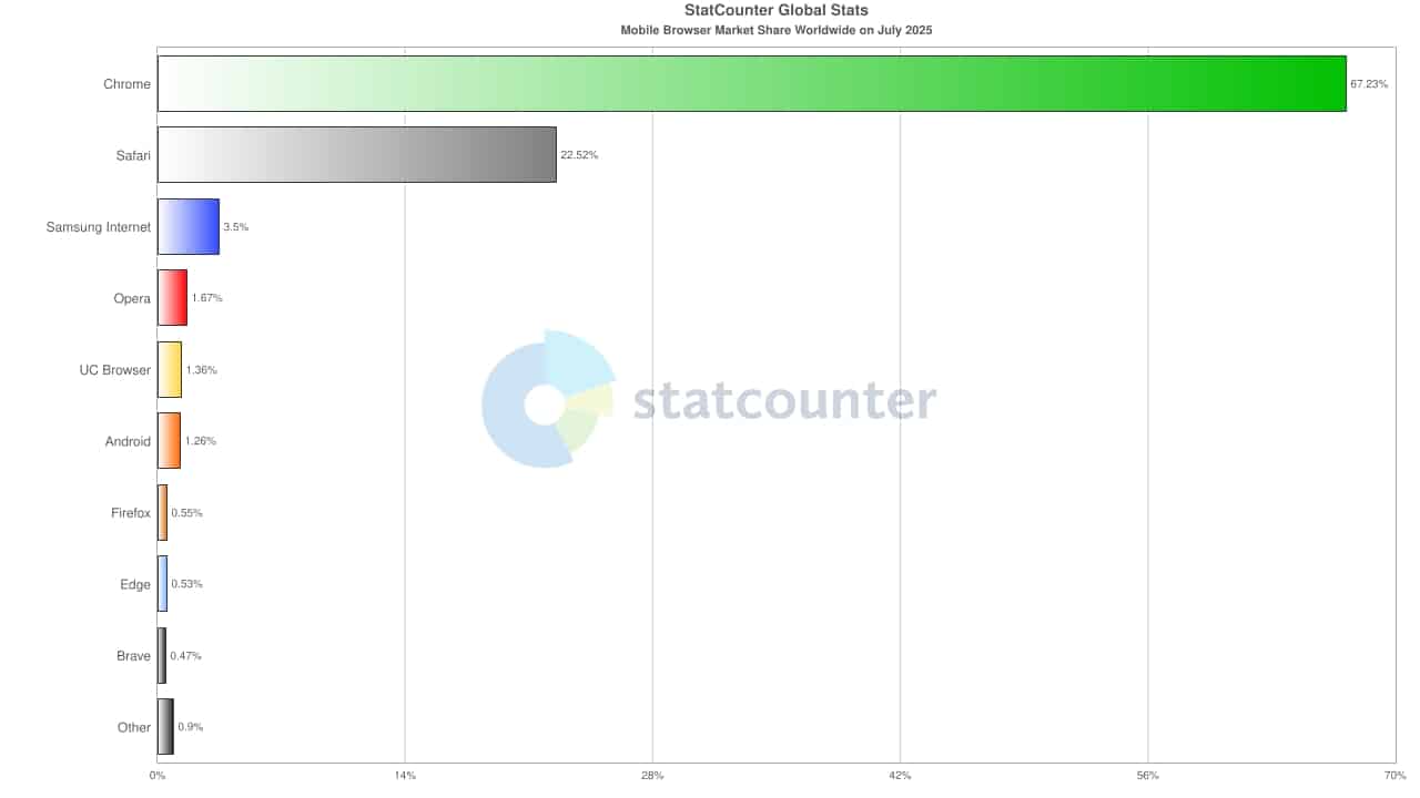 Ο Google Chrome είναι πρώτος με μερίδιο αγοράς 67,32%, ο Safari δεύτερος με 22,42% και το Samsung Internet τρίτο με 3,5%.