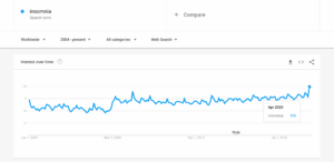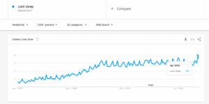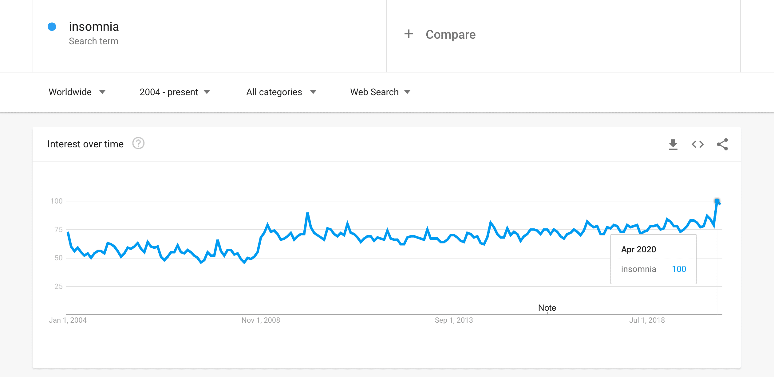 Οι αναζητήσεις για τους όρους “αϋπνία” και “δεν μπορώ να κοιμηθώ” (“insomnia” και “can’t sleep”) έφτασαν σε ένα πολύ υψηλό επίπεδο τον Απρίλιο, σύμφωνα με το Google Trends. Τα δεδομένα δεν αποκαλύπτουν βέβαια τα ακριβή αιτία των αναζητήσεων, αλλά το χρονοδιάγραμμα συμπίπτει με το ύψος των παγκόσμιων lockdown για τον COVID-19.