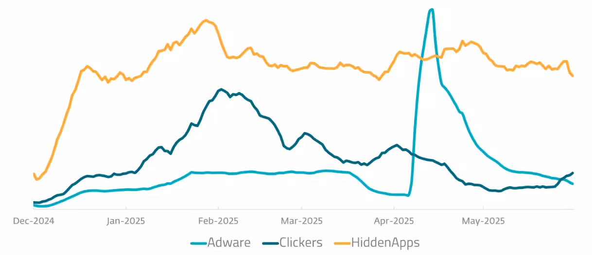 Ανιχνεύσεις Android Adware, Clicker, and HiddenApp το δεύτερο εξάμηνο του 2024 και το πρώτο εξάμηνο του 2025 (Πηγή: ESET Threat Report 1ο Εξάμηνο 2025)