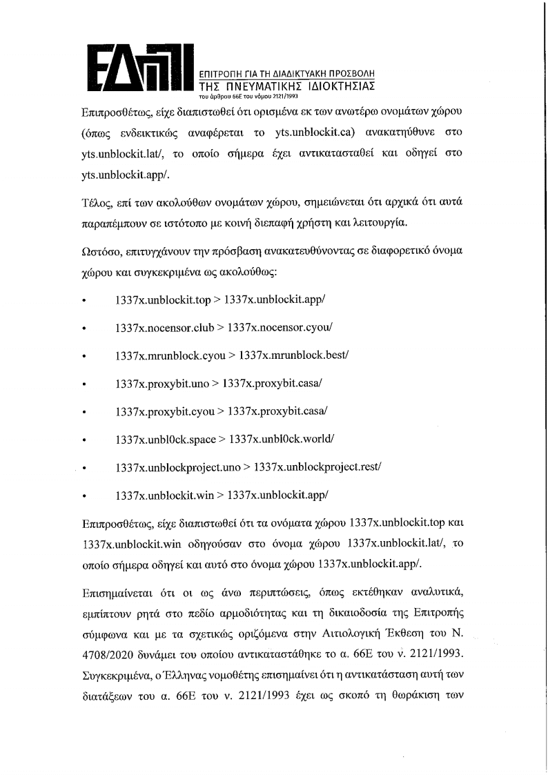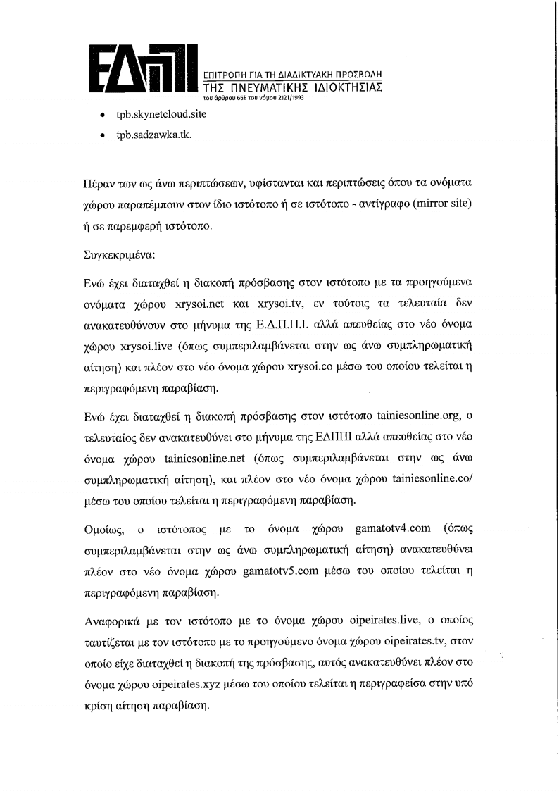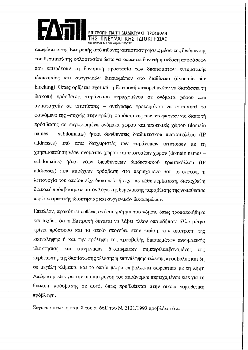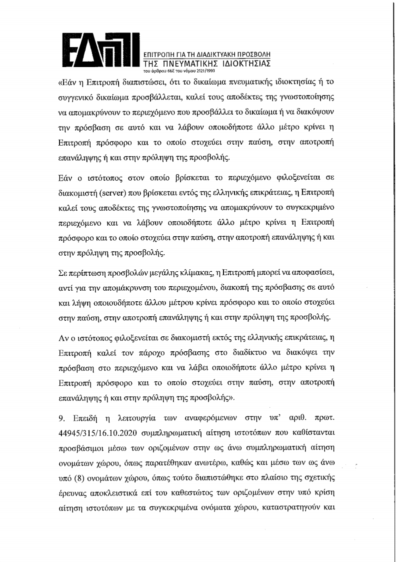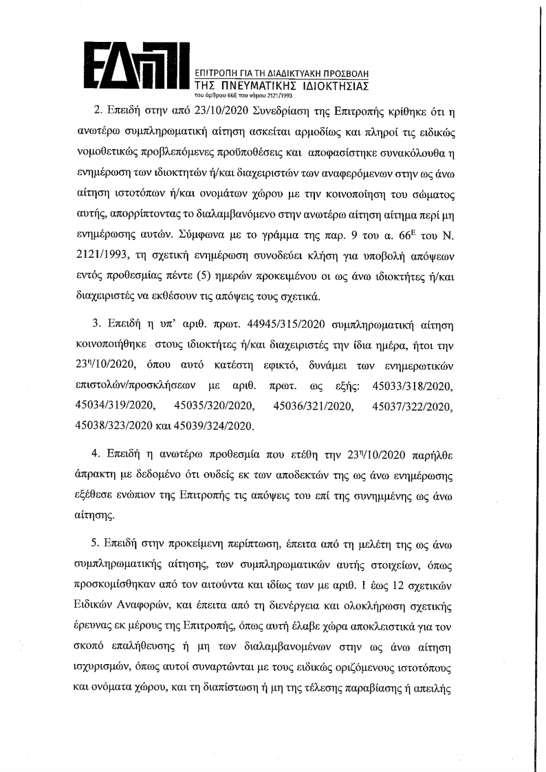 2. Επειδή στην από 23/10/2020 Συνεδρίαση της Επιτροπής κρίθηκε ότι η ανωτέρω συμπληρωματική αίτηση ασκείται αρμοδίως και πληροί τις ειδικώς νοµοθετικώς προβλεπόμενες προΌποθέσεις και αποφασίστηκε συνακόλουθα η ενημέρωση των ιδιοκτητών ή/και διαχειριστών των αναφερόμενων στην ως άνω αίτηση ιστοτόπων ή/και ονομάτων χώρου µε την κοινοποίηση του σώματος αυτής, απορρίπτοντας το διαλαμβανόμενο στην ανωτέρω αίτηση αίτημα περί μη ενηµέρωσης αυτών. Σύμφωνα με το γράμμα της παρ. 9 του α. 66E του Ν 2121/1993, τη σχετική ενηµέρωση συνοδεύει κλήση για υποβολή απόψεων εντός προθεσμίας πέντε (5) ημερών προκειμένου οι ως άνω ιδιοκτήτες ή/και διαχειριστές να εκθέσουν τις απόψεις τους σχετικά.