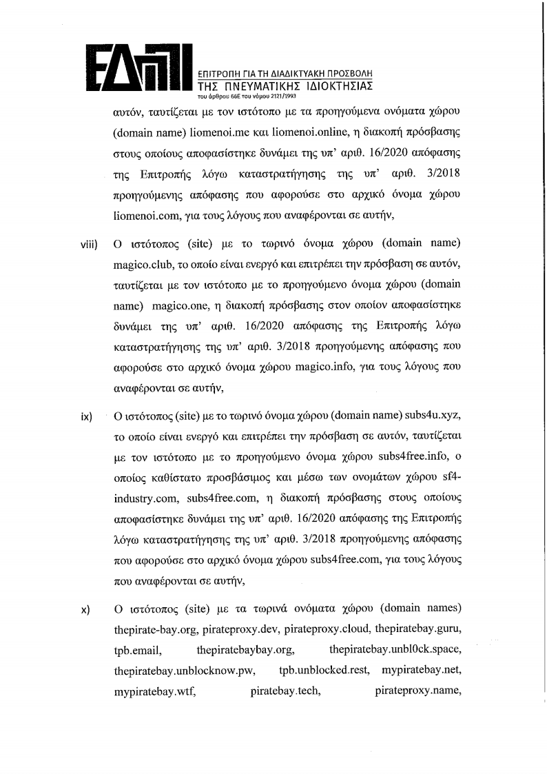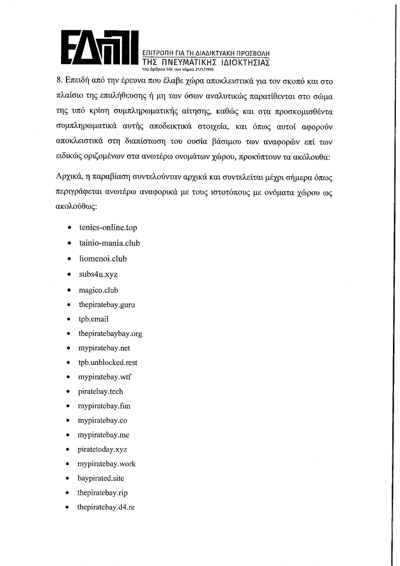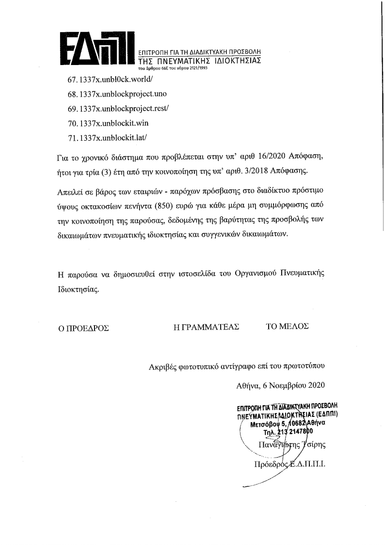 Η Επιτροπή για τη Διαδικτυακή Προσβολή της Πνευματικής Ιδιοκτησίας (Ε.Δ.Π.Π.Ι.) συνεδρίασε μυστικά την 6η Νοεμβρίου 2020, ημέρα Παρασκευή, στην έδρα αυτής και σε πλήρη απαρτία, με την παρουσία των Παναγιώτη Τσίρη, Προέδρου, Ασημίνας Γιαννοπούλου, Γραμµατέα και Ευάγγελου Παπακωνσταντίνου, Μέλους Για να αποφασίσει επί της υπ, αριθ. πρωτ. 44945/315/16.10.2020 συμπληρωματικής αίτησης του Οργανισμού Συλλογικής Προστασίας με την επωνυµία “Εταιρία Προστασίας Οπτικοακουστικών Έργων” (Ε.Π.Ο.Ε.), με έδρα επί της Λεωφόρου Μεσογείων αρ. 275, νομίµως εκπροσωπούμενης.