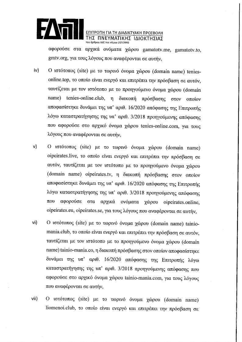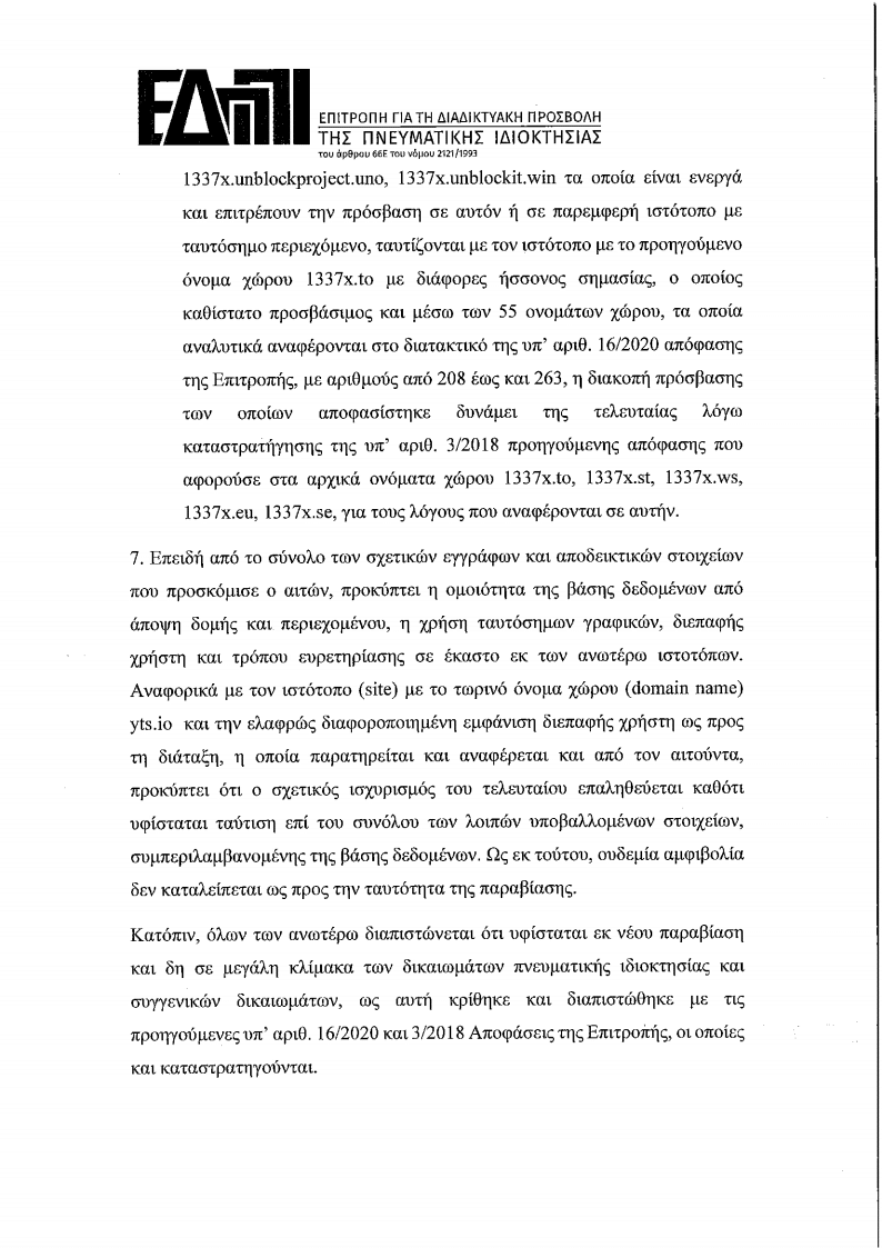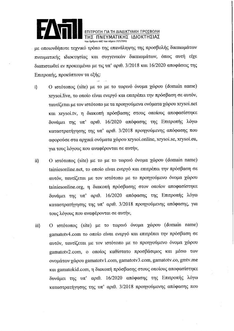 1. Επειδή δυνάµει της υπ, αριθ. πρωτ. 44945/315/16.10.2020 συμπληρωματικής αίτησης δυνάμει της παρ. 9 του α. 66Ε του Ν. 2121/1993, όπως έχει τροποποιηθεί και ισχύει, καθώς και των συμπληρωματικών αυτής αποδεικτικών στοιχείων και σχετικών έντυπων και ψηφιακών αρχείων, 0 Οργανισμός Συλλογικής Προστασίας µε την επωνυμία “Εταιρία Προστασίας Οπτικοακουστικών ‘Εργων” (Ε.Π.Ο.Ε.), με έδρα επί της Λεωφόρου Μεσογείων αριθ. 275, νοµίμως εκπροσωπούμενου, αιτείται την έκδοση νέας απόφασης λόγω παραβίασης των υπ΄ αριθ. 16/2020 και 3/2018 Αποφάσεων της παρούσας Επιτροπής, οι οποίες λήφθηκαν σε συνέχεια της υπ, αριθ. πρωτ. 44176/276/20.Ο8.2020 συμπληρωματικής αίτησης και της υπ, αριθ. πρωτ. 34796/1/Ο5.09.2Ο18 αίτησης αντίστοιχα του ιδίου ως άνω αιτούντος, και επανάληψης, άλλως εξακολούθησης τέλεσης της προσβολής των δικαιωμάτων πνευματικής ιδιοκτησίας και συγγενικών δικαιωμάτων των εκπροσωπούμενων από τον τελευταίο μελών του.