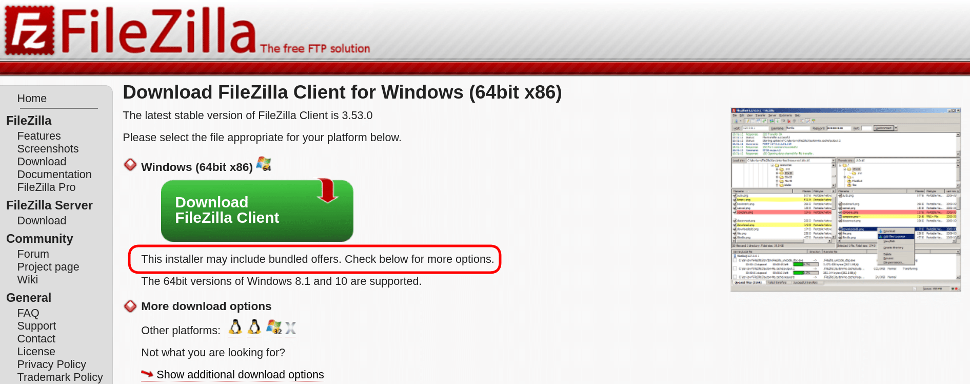 Ωστόσο, υπάρχει μια καλύτερη επιλογή καθώς το project διατηρεί αντίγραφα της έκδοσης του προγράμματος χωρίς adware. Το μόνο που χρειάζεται να κάνετε είναι να επισκεφτείτε την διεύθυνση URL: https://filezilla-project.org/download.php?show_all=1
