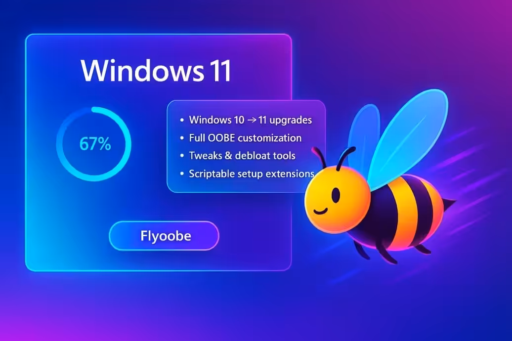 Το γνωστό Flyby11 μετονομάστηκε σε Flyoobe από την έκδοση 0.35. Το “oobe” στο όνομα αναφέρεται στο “out of the box experience”, επειδή η εφαρμογή στρέφει την προσοχή της στην απλοποίηση της εμπειρίας OOBE, μειώνοντας κατά κάποιο τρόπο τον όγκο των Windows.