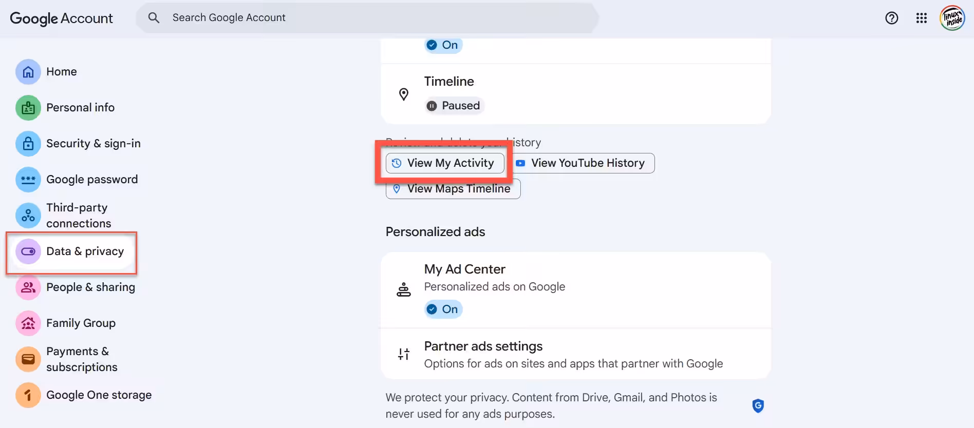 Η Google τα ξέρει όλα για εσάς και υπάρχει τρόπος να το δείτε. Απλά ανοίξτε τον λογαριασμό σας στην Google (Gmail, YouTube, Android κ.λπ.) και ακολουθήστε την παρακάτω διαδρομή: Data & Privacy – View my Activity όπως φαίνεται και παρακάτω. Μπορείτε να δείτε φυσικά και τα View YouTube History, και Google Maps Timeline