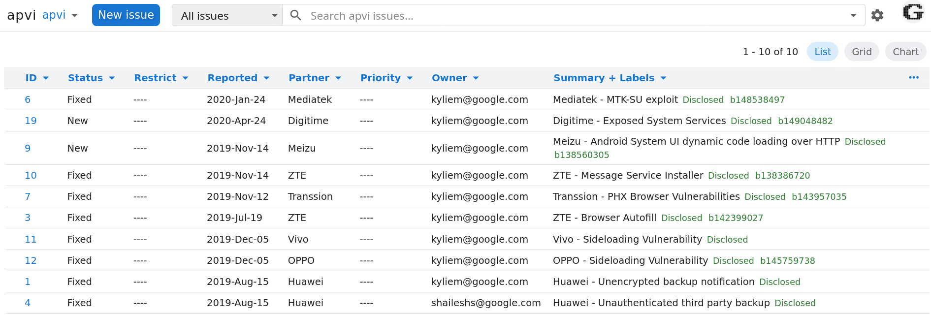 Μπορείτε να παρακολουθείτε τις πιο πρόσφατες γνωστές ευπάθειες στο πρόγραμμα εντοπισμού σφαλμάτων μέσω του Chromium bug tracker.