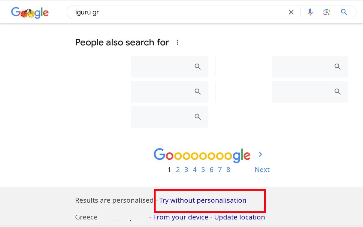 Ένα κλικ ή ένα πάτημα στον σύνδεσμο “δοκιμάστε χωρίς εξατομίκευση” φορτώνει ξανά τα αποτελέσματα χωρίς εξατομικευμένα αποτελέσματα. Με άλλα λόγια: θα έχετε πληροφορίες σαν να μην ήξερε η Google τίποτα για εσάς (πολύ καλό για να ναι αληθινό). Αν και αυτό δεν εγγυάται ότι τα αποτελέσματα θα είναι διαφορετικά, μπορεί να βοηθήσει τους χρήστες της Google που δεν τους αρέσουν να εξατομικευμένα αποτελέσματα.