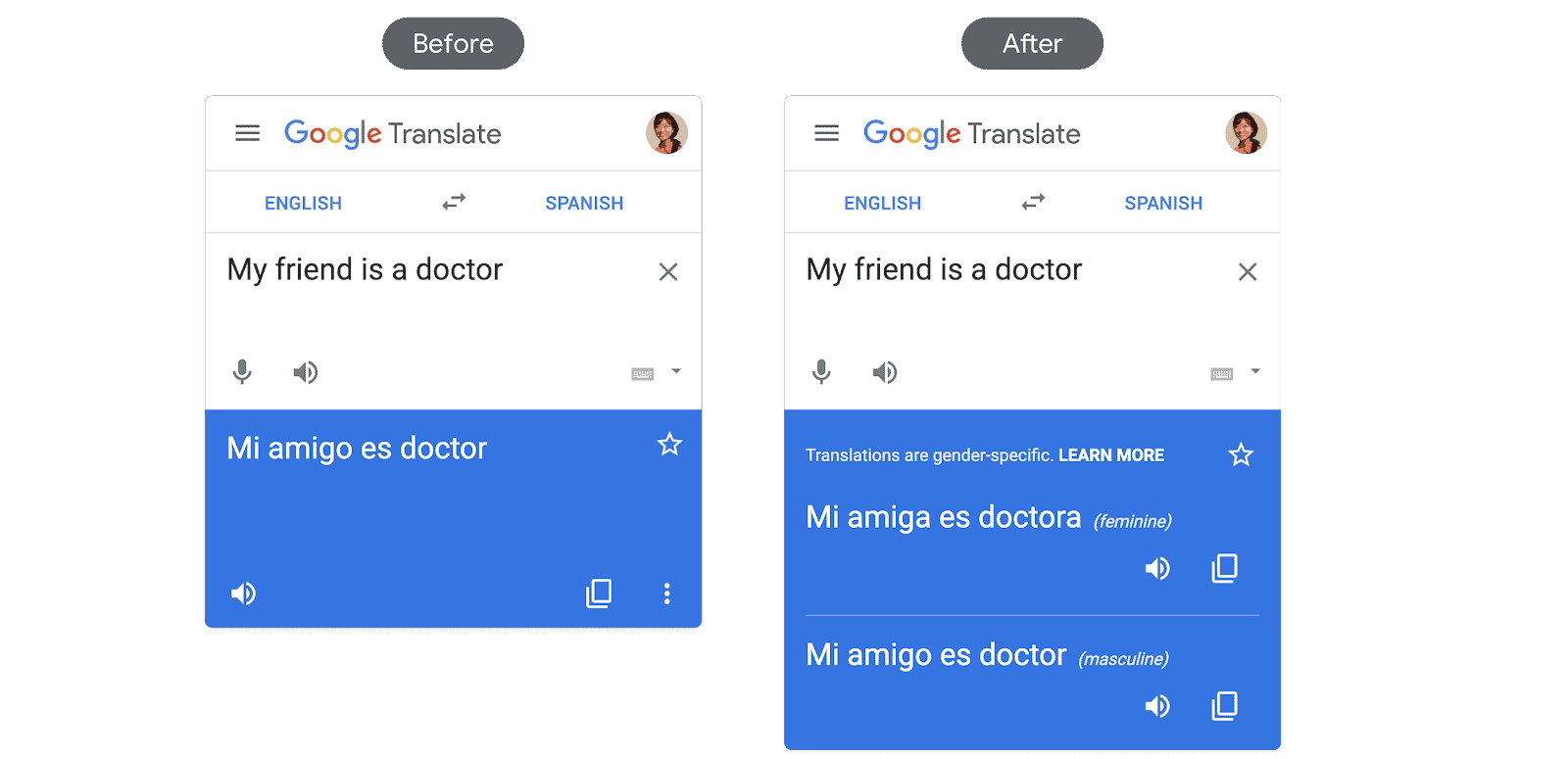 Αριστερά: Πρώιμο παράδειγμα της μετάφρασης μιας αγγλικής φράσης ουδέτερης ως προς το φύλο σε ένα ισπανικό αντίστοιχο για κάθε φύλο. Σε αυτήν την περίπτωση, δίνεται μόνο ένα παράδειγμα που μπορεί να μεροληπτεί. Δεξιά: Η νέα Μετάφραση παρέχει μια επιλογή (θηλυκό – αρσενικό) φύλου.