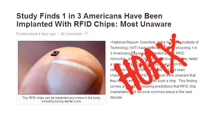 Μια από αυτές προέρχεται από την σατιρική ιστοσελίδα του National Report, όταν ένα άρθρο αναφέρει ότι κάποιοι Αμερικανοί έχουν εμφυτευμένο εν αγνοία τους RFID (Radio-Frequency Identification) τσιπ.