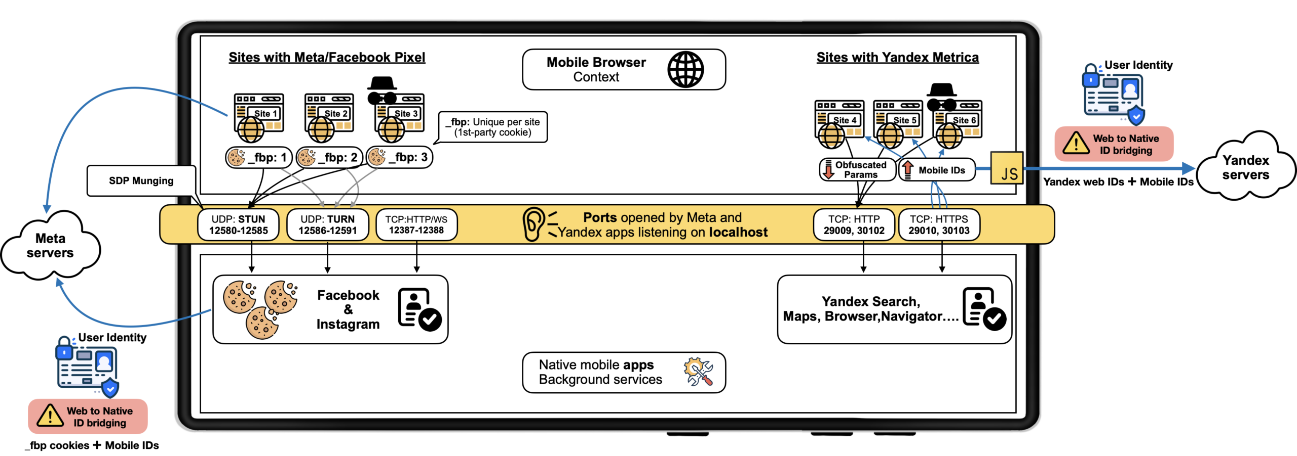 Και οι δύο εταιρείες στέλνουν web αιτήματα σε τοπικές θύρες του Android όταν οι χρήστες επισκέπτονταν ιστότοπους με τον κώδικα (pixel) παρακολούθησης. Οι εγγενείς εφαρμογές χρησιμοποιούσαν τις ίδιες θύρες, ξεπερνώντας ουσιαστικά τα εμπόδια που υπάρχουν για την αποτροπή αυτού του είδους παρακολούθησης.