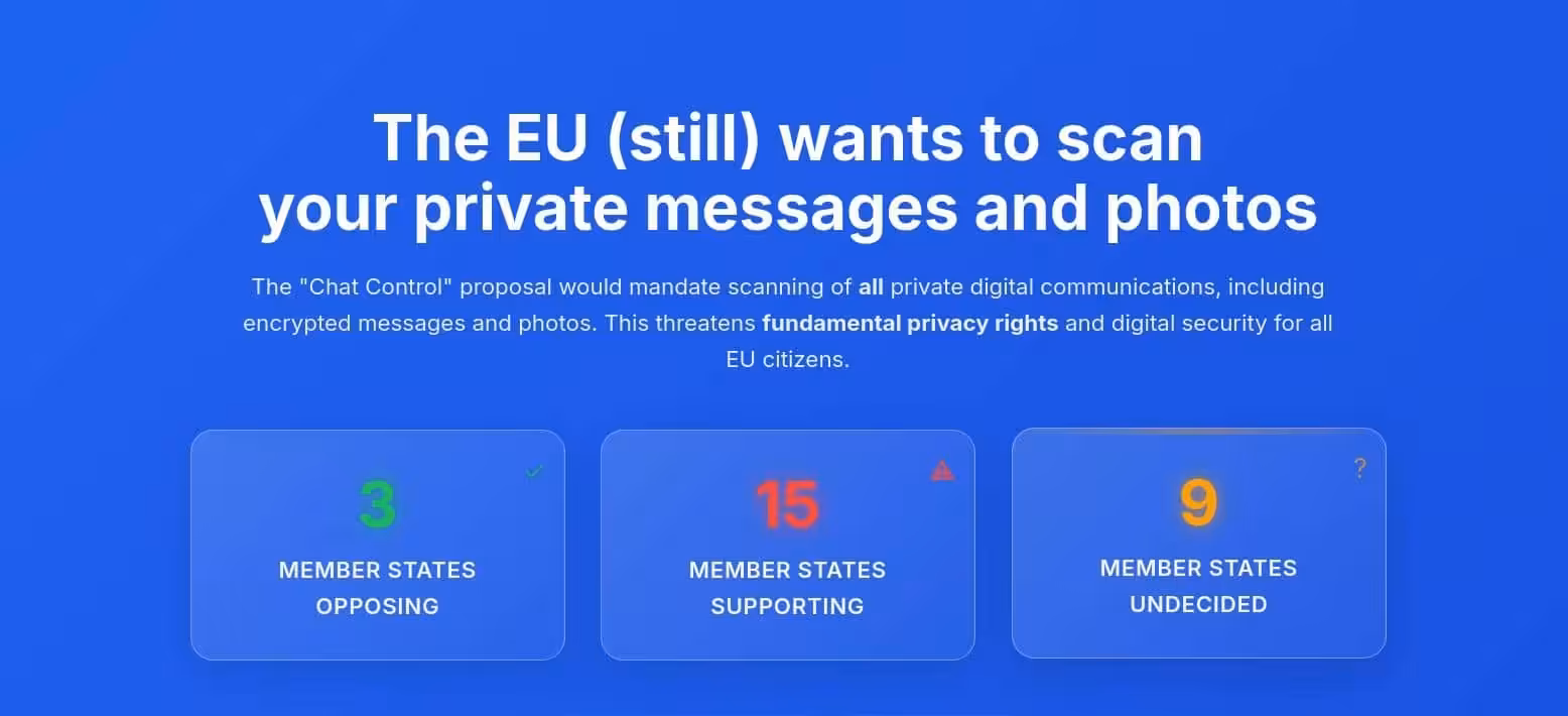 Η εκστρατεία “Καταπολέμηση του Ελέγχου Συνομιλίας” ή “Fight Chat Control” ξεκίνησε για να πείσει τους κατοίκους των κρατών-μελών της ΕΕ να επικοινωνήσουν με τα μέλη του Ευρωπαϊκού Κοινοβουλίου για αυτό το θέμα.