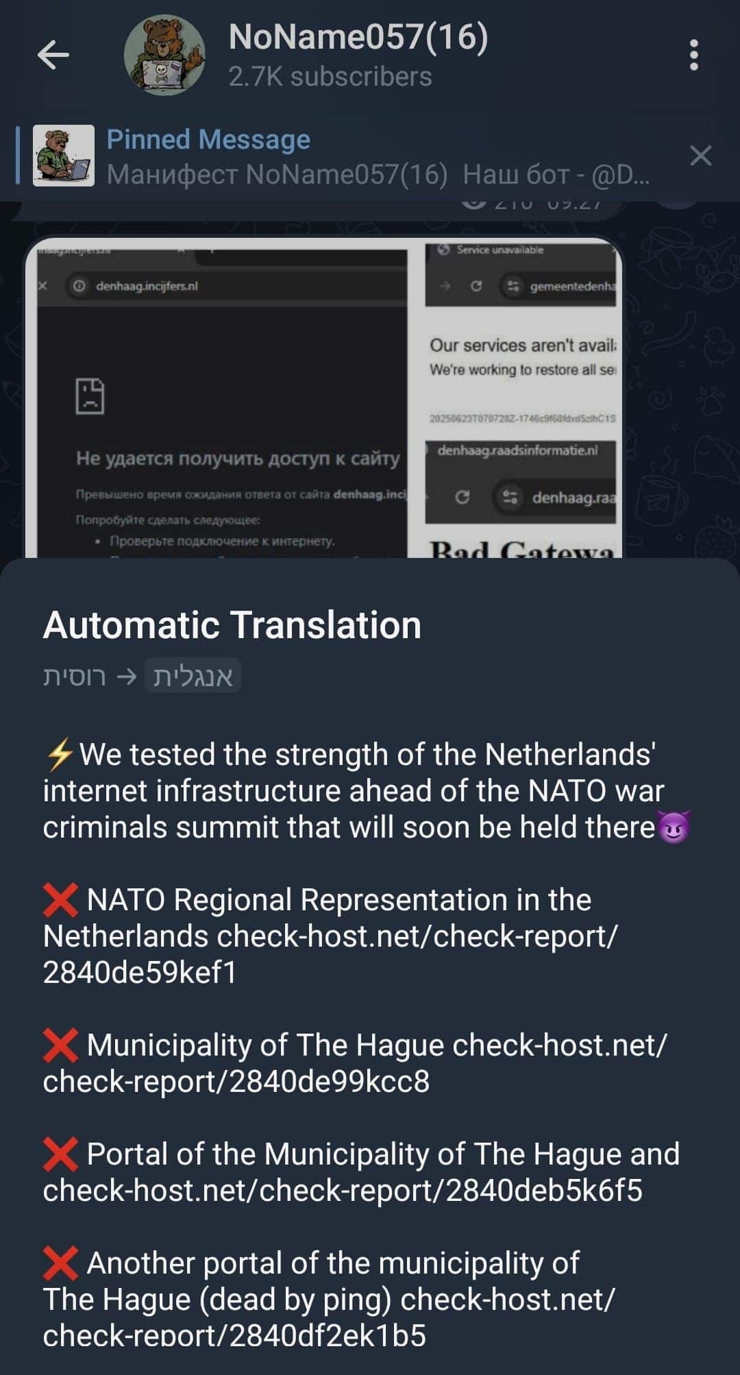 - Δηλωμένοι Στόχοι: Σύμφωνα με αναρτήσεις σε φιλορωσικά φόρουμ του dark web, η ομάδα Noname057(16) ισχυρίζεται ότι έχει στοχεύσει το γραφείο του ΝΑΤΟ στην Ολλανδία, καθώς και επιλεγμένες ψηφιακές πύλες του δήμου της Χάγης.