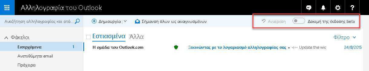 Οι χρήστες του Outlook.com μπορούν να δοκιμάσουν τα νέα χαρακτηριστικά του Outlook.com, του Ημερολογίου και των επαφών, επιλέγοντας το μενού “Δοκιμάστε την έκδοση beta” στην επάνω δεξιά γωνία των εισερχομένων.
