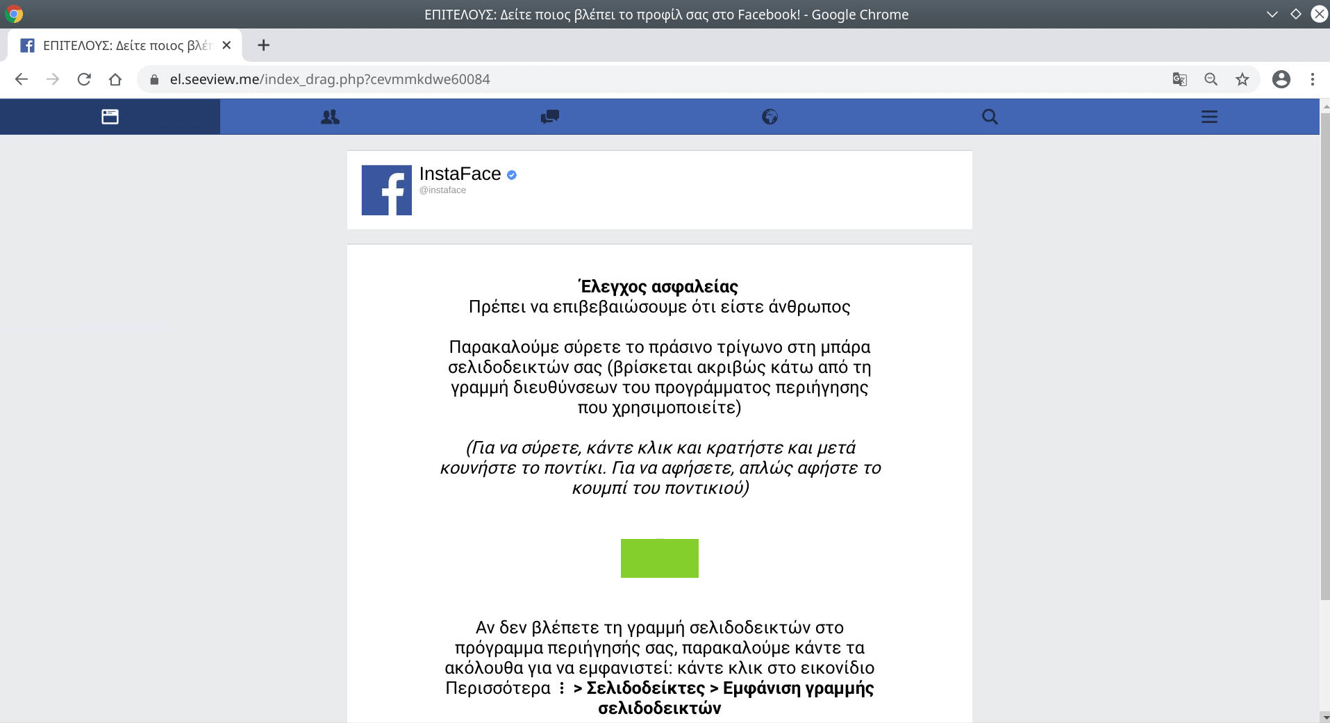 Μια εφαρμογή (InstaFace) που ΔΕΝ φιλοξενείται στο Facebook (αν και έχουν προσπαθήσει να φαίνεται έτσι) ισχυρίζεται ότι μπορεί να σας εμφανίσει ποιος βλέπει το προφίλ σας. Δεν ισχύει.