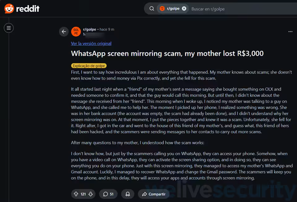Μια νέα, ύπουλη τακτική που κερδίζει έδαφος τελευταία είναι η εξαπάτηση χρηστών ώστε να μοιραστούν την οθόνη του κινητού τους κατά τη διάρκεια μιας βιντεοκλήσης. Η λειτουργία κοινής χρήσης οθόνης, που προστέθηκε στο WhatsApp από το 2023, χρησιμοποιείται πλέον από απατεώνες για να κλέψουν προσωπικά δεδομένα, ταυτότητες και χρήματα, χωρίς να το καταλάβετε, προειδοποιεί ο Christian Ali Bravo από την ομάδα της παγκόσμιας εταιρίας ψηφιακής ασφάλειας ESET.