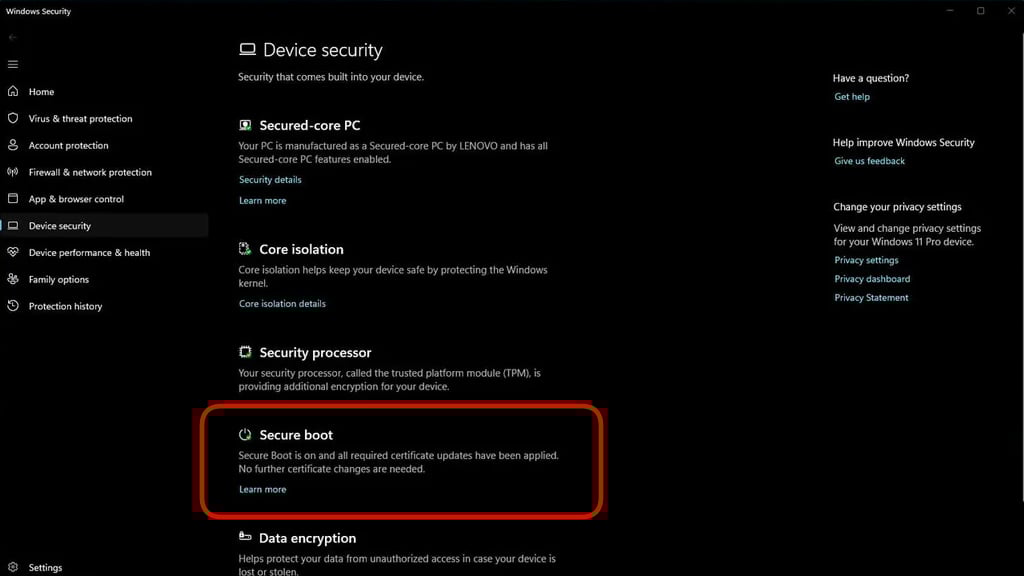 Στα Windows 11, μεταβείτε στις Ρυθμίσεις, επιλέξτε Απόρρητο και ασφάλεια, επιλέξτε Ασφάλεια των Windows και στη συνέχεια, κάντε κλικ στην επιλογή Ασφάλεια συσκευής. Κύλιση προς τα κάτω στη ρύθμιση Secure Boot.