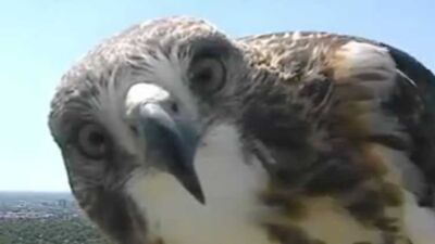 Γεράκι περιεργάζεται κάμερα τηλεοπτικού σταθμού