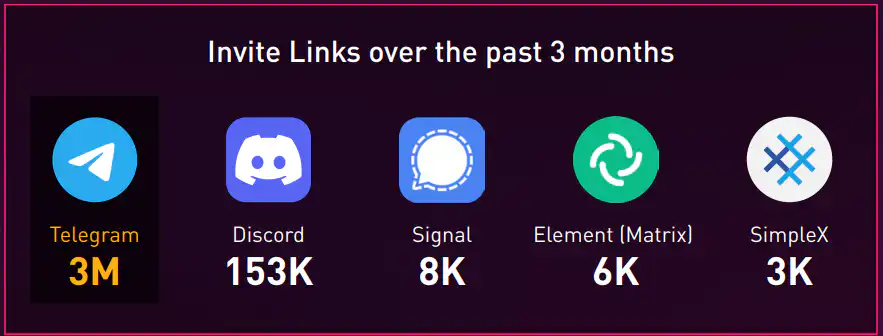 Παρά κάποιες περιορισμένες δοκιμές με εναλλακτικές λύσεις, το Telegram εξακολουθεί να είναι η βασική πλατφόρμα προτίμησης. Μόνο μέσα στους τελευταίους τρεις μήνες, το Check Point Exposure Management εντόπισε περίπου 3 εκατομμύρια invite links του Telegram να διακινούνται σε «υπόγεια» δίκτυα. Συγκριτικά, το Discord αντιστοιχούσε σε λιγότερο από το 6% αυτού του όγκου, ενώ πλατφόρμες όπως το Signal, το SimpleX και λύσεις που βασίζονται στο Matrix είχαν σχεδόν μηδαμινή παρουσία.