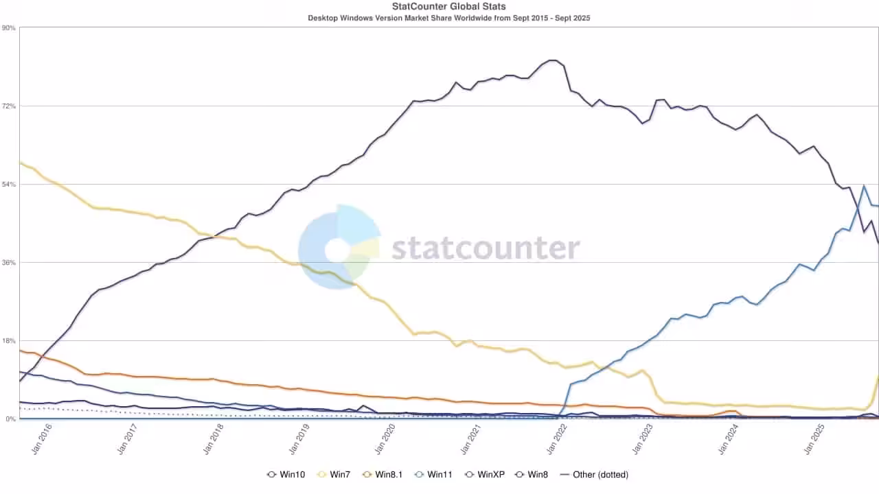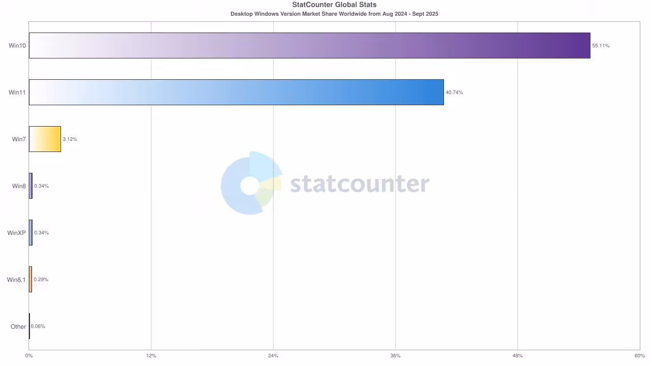 Όσο για τα Windows 11, η Statcounter αναφέρει ότι το παγκόσμιο μερίδιο του συστήματος είναι στο 49,05%, λίγο μικρότερο από ό,τι τον Αύγουστο του 2025.