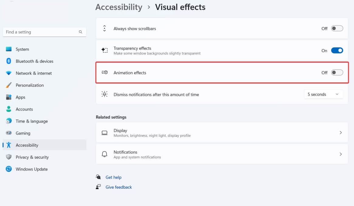 Υπάρχουν δύο τρόποι για να απενεργοποιήσετε τα εφέ κίνησης στα Windows 11. Ο ένας είναι από τις Ρυθμίσεις > Προσβασιμότητα > Οπτικά εφέ. Απενεργοποιήστε τα “Εφέ κίνησης”.