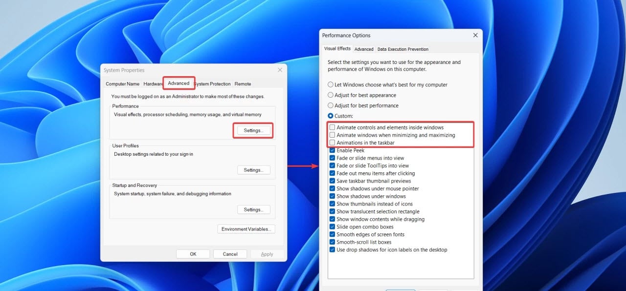 Κάντε κλικ στις “Ρυθμίσεις” στην ενότητα Απόδοση και απενεργοποιήστε τις παρακάτω επιλογές: