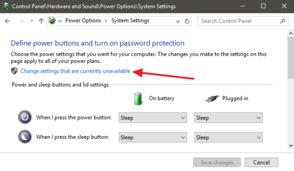 Τώρα, κάντε κλικ στο Αλλαγή ρυθμίσεων που δεν είναι διαθέσιμες αυτήν τη στιγμή και αποεπιλέξτε το πλαίσιο ενεργοποίησης γρήγορης εκκίνησης.